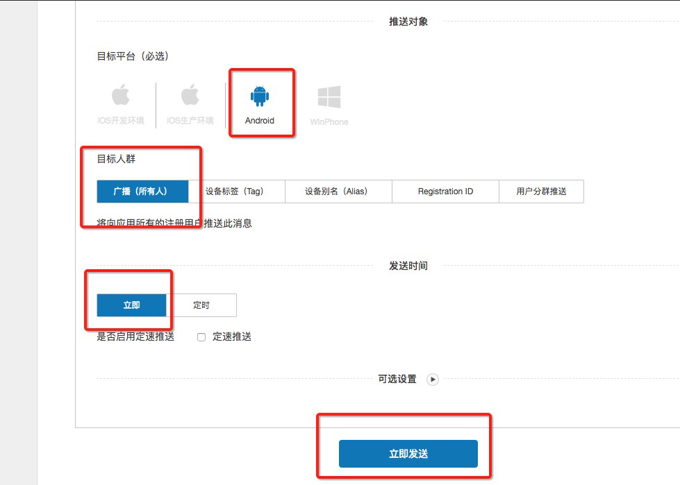 在推送栏目中选择发送通知,填写推送信息,选择推送平台(安卓)、目标人群、发送时间。点击立即发送。消息推送即配置完成。